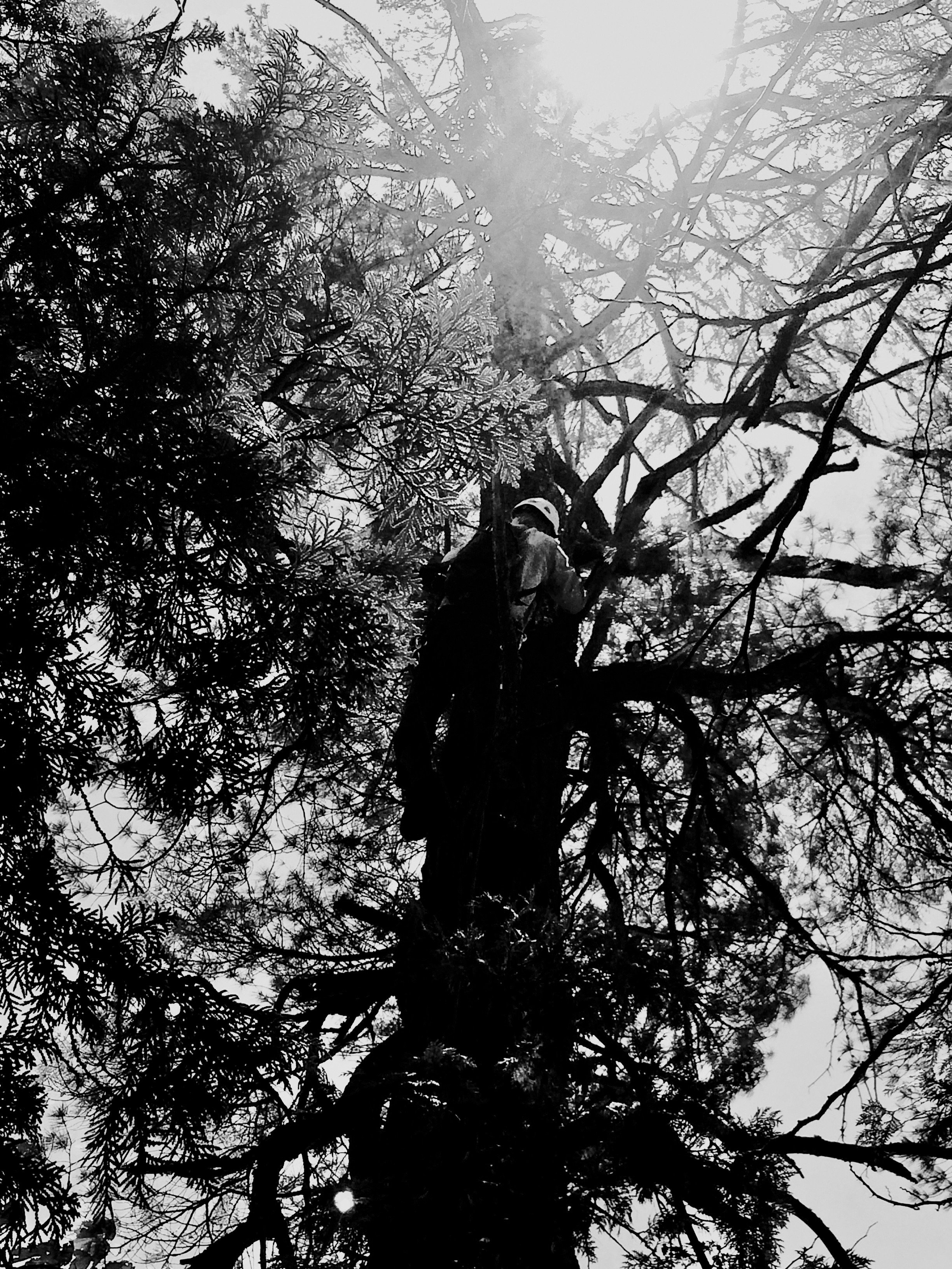Teryl Grubbs climbs the tall white pine with the 2-ton eagle nest.